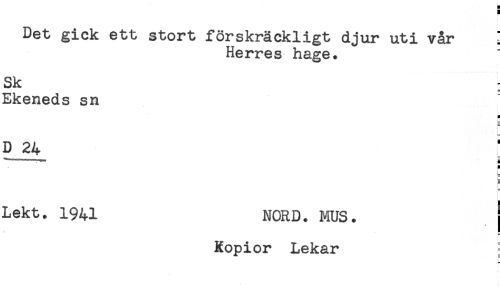 //// Det gick ett stort förskräckligt djur uti vår [ //// Herres hage. //// Sk - //// Ekeneds sn //// H //// = //// a //// F //// Lekt. 1941 NORD. MUS. j //// - //// Kopior Lekar ////