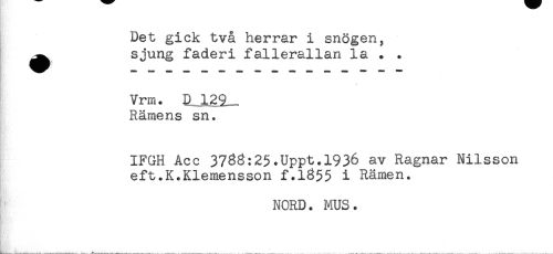 //// Det gick två herrar i snögen, //// ^ sjung faderi fallerallan la . . //// ^^^^ *** ^^ //// Vrm. RJL29_ //// Rämens sn. //// IFGH Acc 3733:25.Uppt.1936 av Ragnar Nilsson //// eft.K.Klemensson f.l355 i Ramen. //// NORD. MUS. ////