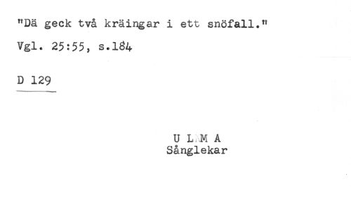 //// "Dä geck två kräingar i ett snöfall." //// Vgl. 25:55, s.184 //// D 129 //// U L M A //// Sånglekar //// t ////