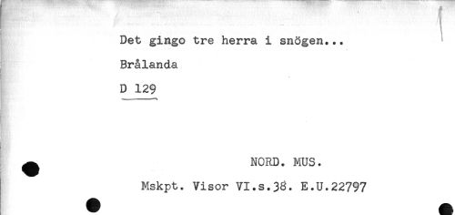 //// Det gingo tre herra i snögen... //// \ //// Brålanda //// D 129 //// """t*-" "" ..... //// ^ NORD. MUS. //// Mskpt. Visor VI.s.3^. E.U.22797 ////