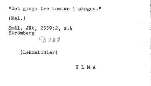 //// "Det gingo tre tomter i skogen." ; //// (Mel.) //// <' * //// Smål. Jät, 2559:2, s.4 //// Strömberg //// Q y-%7 I //// (Lekmelodier) ! //// i //// U L M A //// ! ////