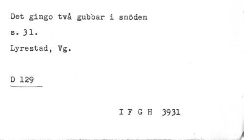 //// Det gingo två gubbar i snöden //// s. 31. //// Lyrestad, Vg. //// D 129 //// I .....u , .. ^ //// * //// I F G H 3931 ////