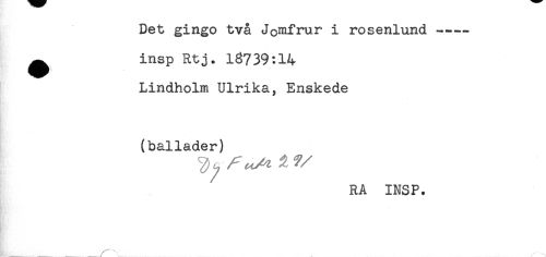 //// Det gingo två Jomfrur i rosenlund---- //// ^ insp Rtj. 13739:14 //// Lindholm Ulrika^ Enskede //// (ballader) //// RA INSP. //// ...r** ////