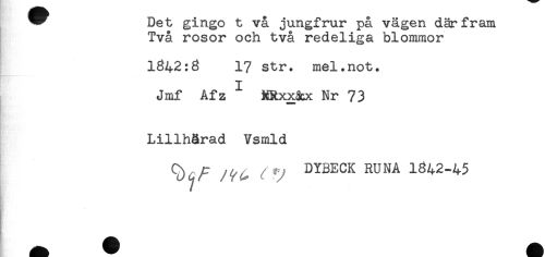 //// ^^ Det gingo t vå jungfrur på vägen där fram //// Två rosor och två redeliga blommor //// //// /1842:8 17 str. mel.not. //// Jmf Afz NRxx&x Nr 73 //// Lillhårad Vsmld //// ^ DYBECK RUNA 1842-45 ////