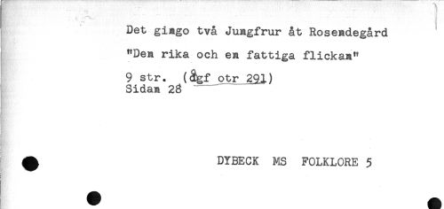 //// ^ 'i //// Det gi^go två Jungfrur åt RoseMegård //// i //// "Den rika och ea. fattiga flickan" //// 9 str. (ågf otr 291) //// Sidan 28 --- //// BK*! //// i //// 1 //// < //// ^ DYBECK MS FOLKLORE 5 //// ' ////