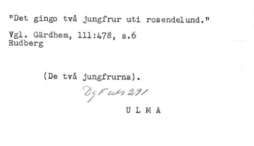 //// "Det gingo två jungfrur uti rosendelund." //// Vgl. Gärdhem, 111:473, s.6 //// Rudberg //// (De två jungfrurna). //// U L M A ////