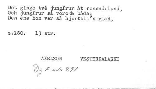//// Det gingo två jungfrur åt rosendelund, //// Och jungfrur så voro de båda: //// Den ena hon var så hjerteli n glad, //// s.180. 13 str. //// AXELSON VESTERDALARNE ////