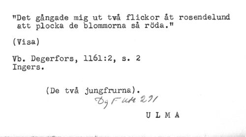 //// "Det gångade mig ut två flickor åt rosendelund //// att plocka de blommorna så röda." //// (Visa) //// Vb. Degerfors, llél:2, s* 2 //// Ingers. //// (De två jungfrurna). //// U L M A //// - . . - ... ./-t . - . . f^. ////