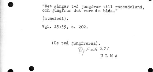 //// V "Det gångar två jungfrur till rosendelund, //// } och jungfrur det voro de båda." //// (m.melodi). //// Vgl. 25:55, s. 202. //// (De två jungfrurna). //// U L M A //// - //// i' ^^^^^ ^Étt ////