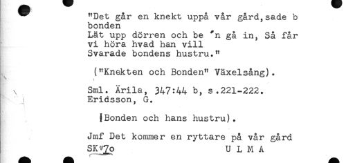 //// ^ "Det går en knekt uppå vår gård,sade b //// bonden //// Lät upp dörren och be *n gå in, Så får //// vi höra hvad han vill //// Svarade bondens hustru." //// ("Knekten och Bonden" Växelsång). //// i-f' * //// Sml. Ärila, 347:44 b, s.221-222. //// ^ Eridsson, G. //// * //// {Bonden och hans hustru). //// Jmf Det kommer en ryttare på vår gård //// SK]^p U L M A ////