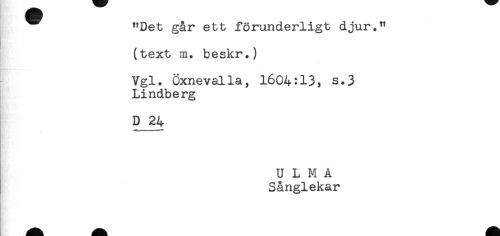 //// "Det går ett förunderligt djur." //// (text m. beskr.) //// Vgl. Öxnevalla, 1604:13, s.3 //// Lindberg //// D 24 //// U L M A //// Sånglekar ////