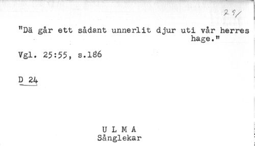 //// * //// - //// "Dä går ett sådant unneriit djur uti vår herres //// hage." //// Vgl. 25:55, s.136 //// ! //// ! //// D 24 //// . i //// < //// i //// U L M A ! //// Sånglekar ////