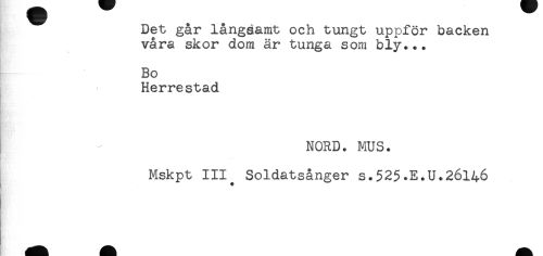 //// Det går långsamt och tungt uppför backen //// våra skor dom är tunga som bly... //// Bo //// I Herrestad //// NORD. MUS. //// Mskpt 111^ Soldatsånger S.525.E.U.26146 ////