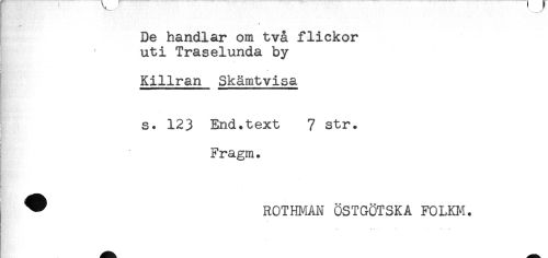 //// t //// De handlar om två flickor //// uti Traselunda by //// { //// Kiliran Skämtvisa //// s. 123 End.text 7 str. //// Fragm. //// ' //// ^ ROTHMAN ÖSTGÖTSKA FOLKM. //// * - - . '- . .-. « ////