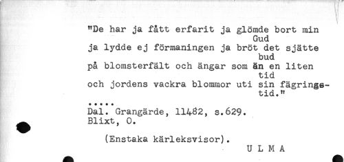 //// "De har ja fått erfarit ja glömde bort min //// Gud //// ja lydde ej förmaningen ja bröt det sjätte //// bud //// på blomsterfält och ängar som än en liten //// tid //// och jordens vackra blommor uti sin fägringe- //// tid." //// ***** //// Dal. Grangärde, 11432, s.629. //// ^ Blixt, 0. //// (Enstaka kärleksvisor). //// U L M A ////