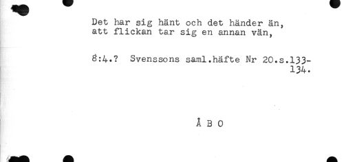 //// Det har sig hänt och det händer än, //// att flickan tar sig en annan vän, //// 6:4.? Svenssons saml.häfte Nr 20.s.133- //// 134. //// \ //// ÅBO ////