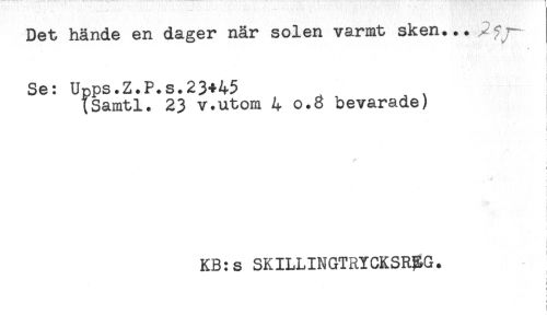 //// Det hände en dager när solen varmt sken... //// - //// ; t //// .. .. - ) //// Se: Upps.Z.P.s.23445 ^ ^ , //// (Samtl. 23 v.utom 4 0.8 bevarade) //// j. //// t* //// ^ ! //// i //// ! //// i //// r //// f //// KB:s SKILLINGTRYCKSREG. //// ! //// i //// < //// < //// 1 ////
