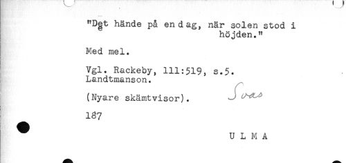 //// t //// "Dgt hände på en dag, när solen stod i //// höjden." //// Med mel. //// Vgl. Rackeby, 111:519, s.5. //// Landtmanson. //// (Nyare skämtvisor). //// 137 //// ^ U L M A ////