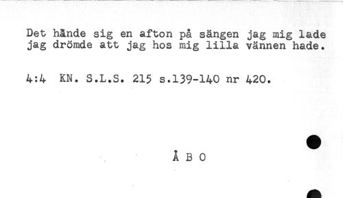 //// Det hände sig en afton på sängen jag mig lade //// jag drömde att jag hos mig lilla vännen hade. //// 4:4 KN. S.L.S. 215 s.139-140 nr 420. //// ÅBO ^ ////