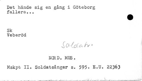 //// Det hände sig en gång i Göteborg //// fallera... ^ //// Sk //// Veberöd //// NCRD. MUS. //// Mskpt II. Soldatsånger s. 595. E.U. 22363 ////