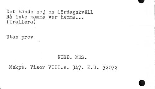 //// ! //// i //// Det hände sej en lördagskväll //// Bå inte mamma var hemma... //// (Trallera) //// j //// Utan prov //// ! //// ! //// t //// NORD. MUS. //// ^ I //// Mskpt. Visor VIII.s. 347. E.U. 32072 ////