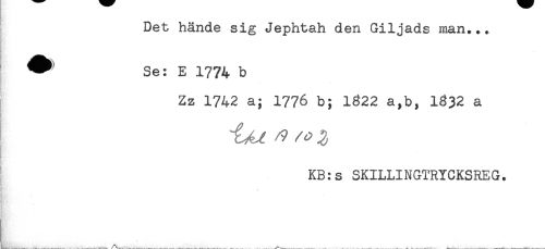 //// Det hände sig Jephtah den Giljads man... //// ^ Se: E 1774 b //// Zz 1742 a; 1776 b; 1622 a,b, 1832 a //// % //// ! //// ! //// KB:s SKILLINGTRYCKSREG. //// s - //// TI ^ ////