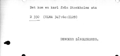 //// Det kom en karl från Stockholms sta //// D 330 (ULMA 347:6o:I129) //// * //// DENCKER SÅNGLEKSREG. ////