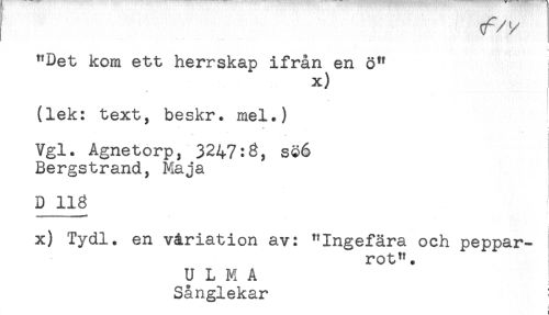 //// { tf/! //// /"Det kom ett herrskap ifrån en ö" //// x) //// (lek: text, beskr. mel.) //// Vgl. Agnetorp, 3247:3, s§6 //// Bergstrand, Maja //// D 118 //// ii : _<:H.HHI-* - //// x) Tydl. en v&riation av: "Ingefära och peppar- //// rot". //// U L M A //// Sånglekar ////
