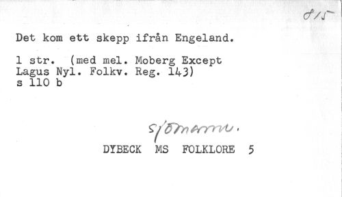 //// Det kom ett skepp ifrån Engeland. //// 1 str. (med mel. Moberg Except //// Lagus Nyl. Folkv. Reg. 143) //// s 110 b //// ! //// t //// i //// f //// ^ AV? 7-4/ . //// DYBECK MS FOLKLORE 5 ////