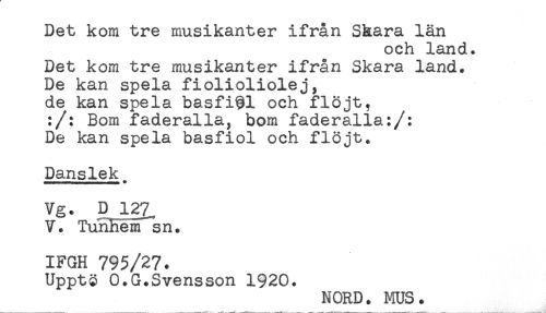 //// Det kom tre musikanter ifrån Shara län //// och land. //// Det kom tre musikanter ifrån Skara land. //// De kan spela fiolioliolej, //// de kan spela basfiol och flöjt, //// :/: Bom faderalla, bom faderalla:/: //// De kan spela basfiol och flöjt. //// Danslek. //// IFGH 795/27. //// Uppta O.G.Svensson 1920. //// NORD. MUS. ////