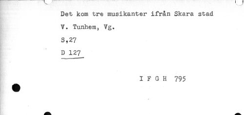 //// Det kom tre musikanter ifrån Skara stad //// V. Tunhem, Vg. //// S,27 //// D 127^ //// I F G H 795 ////