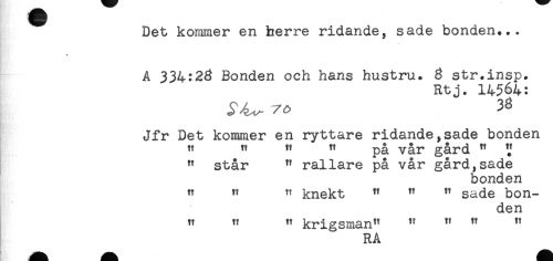 //// Det kommer en herre ridande, sade bonden... //// A 334:28 Bonden och hans hustru. 8 str.insp. //// Rtj. 14564: //// ^ 38 //// Jfr Det kommer en ryttare ridande,sade bonden //// " " " " på vår gård " ? //// " står " rallare på vår gård,sade //// bonden //// " " ^ knekt " " " sade bon- //// den //// " " " krigsman" " " " " //// RA ////