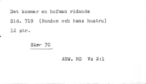//// Det kommer en hofman ridande //// Sid. 719 (Bonden och hans hustru) //// 12 str. //// Skm- 70 //// ARW. MS Vs 2:1 ////