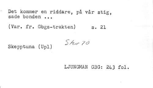 //// Det kommer en riddare, på vår stig, //// sade bonden ... //// (Var. fr. Gbgs-trakten) s. 21 //// Skepptuna (Upl) //// LJUNGMAN GBG: 243 fol. ////