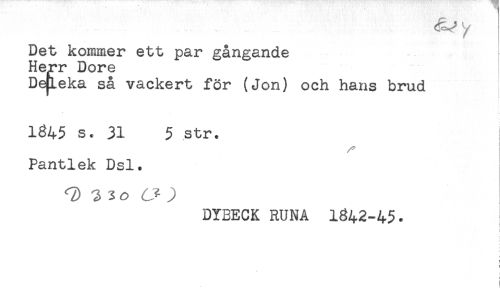 //// Det kommer ett par gångande //// Herr Dore //// De^Leka så vackert för (Jon) och hans brud //// L //// 1845 s. 31 5 str. //// Pantlek Dsl. //// DYEECK RUNA 1842-45. //// t //// ! ////
