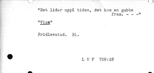 //// "Det lider uppå tiden, det kom en gubbe //// fram. - - -" //// "Visa" //// Fridlevstad. Bl. //// ^ L U F 709:28 ////