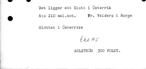 //// jf //// Det ligger ett Slott i Österrik //// ; //// * t //// ^ N:o 210 mel.not. Tr. Valders i Norge //// Slottet i Österrike //// AHLSTRÖM 300 FOLKV. //// < t .. ** //// ^_____ ////