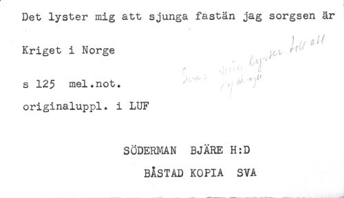 //// Det lyster mig att sjunga fastän jag sorgsen är //// i //// Kriget i Norge //// t, - ' 4 " //// s 125 mel.not. ^ ^ ' //// / //// /originaluppl. i LUF //// SÖDERMAN BJÄRE H:D //// BÅSTAD KOPIA SVA //// . - - ^..,...-....... ^ ___ . ////