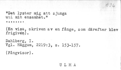 //// - //// "Det lyster mig att sjunga //// uti min ensamhet." //// (En visa. skriven av en fånge, som därefter blev //// frigivän). //// i //// * //// - //// Dahlberg, 1. //// Vgl. Häggum, 2219:3, s. 153-157. //// (Fångvisor). //// r //// i //// U L M A ////