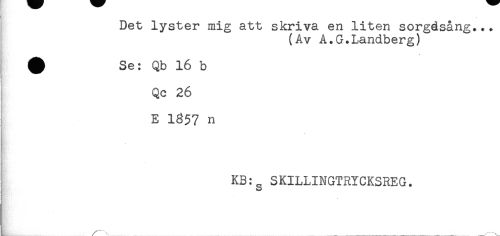 //// ^ Det lyster mig att skriva en liten sorgdsång... //// (Av A.G.Landberg) //// å) Se: Qb 16 b //// Qc 26 //// j E 18$7 n //// t //// KB:^ SKILLINGTRYCKSREG. //// i ^ //// nB?'''' //// A'. //// n //// t //// ' .... . _ _ _ _ ////