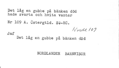 //// Det låg en gubbe på bänken död //// hade svarta och hvita vantar //// Nr 109 A. Östergtld. Sö-HC. //// Jmf //// Det låg en gubbe på bänken död //// < //// t //// NORDLANDER BARNVISOR ////