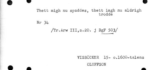 //// Thett migh nu späddes, thett iagh nu aldrigh //// trodde //// Nr 34 //// /Tr.Arw III,s.20. j DgF 503 //// /. //// - //// VISBÖCKER 15- o.l600-talens //// 0LUFFS0N ////