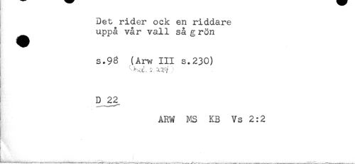//// Det rider ock en riddare //// uppå vår vall så g rön //// s.93 (Arw III s.230) //// D ^2 //// ARW MS KB Vs 2:2 //// t //// H ' *<* ' ' //// ! < ////