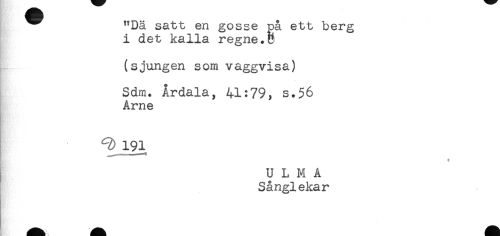 //// ^ "Dä satt en gosse på ett berg //// i det kalla regne.P //// (sjungen som vaggvisa) //// Sdm. Årdala, 41:79, s.56 //// Arne //// I 191 //// } U L M A //// Sånglekar ////