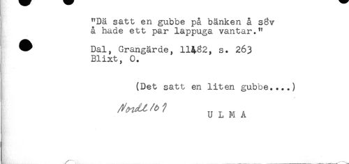//// "Dä satt en gubbe på bänken å s8v //// å hade ett par lappuga vantar." //// ^ Dal, Grangärde, 114,82, s. 263 //// [ Blixt, 0. //// (Det satt en liten gubbe....) //// ULM A ////
