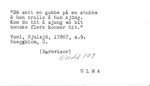//// "Dä satt en gubbe på en stubbe //// å han tralla å,han sjöng. //// Kom du hit å sjung en bit //// kanske flera kommer hit." //// Vsml, Hjulsjö, 1736?, s.9. //// Haeggblom, C. //// (Barnvisor) //// , - ^ //// U L M A ////