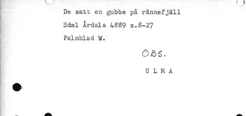 //// De satt en gubbe på rännefjäll //// Sdml Årdala 4339 s.3-27 //// Palmblad W. //// ÖRg, //// B //// U L M A ////
