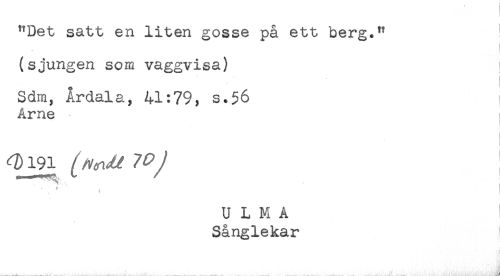 //// "Det satt en liten gosse på ett berg." //// (sjungen som vaggvisa) i //// < < //// Sdm, Årdala, 41:79, s.$6 //// Arne //// j //// ',i //// U L M A ' //// Sånglekar ! ////