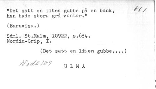 //// "Det satt en liten gubbe på en bänk, //// han hade stora grå vantar." //// (Barnvisa.) //// i //// . ... //// Sdml. St.Malm, 10922, s.654. //// Nordin-Grip, 1. //// (Det satt en liten gubbe....) //// U L M A ////