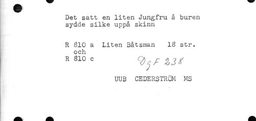 //// Det satt en liten Jungfru å buren //// sydde silke uppå skinn //// R 310 a Liten Båtsman 13 str. //// och //// UUB CEDERSTRÖM MS //// ' f - ////